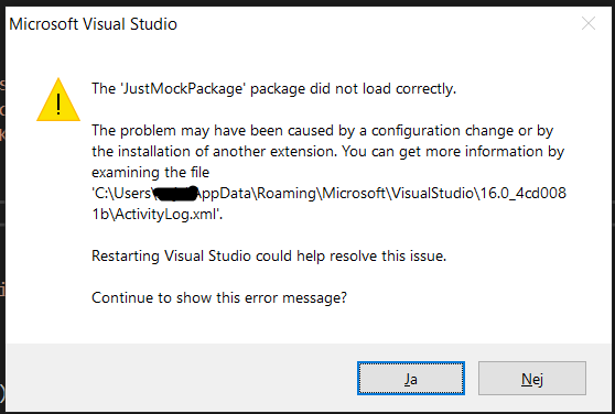 When installing Justmock I'm using an elevated admin account and it seems to complete without any errors, afterwards I'm starting VS19 as my normal user and are presented with the dialog shown in the attached file.