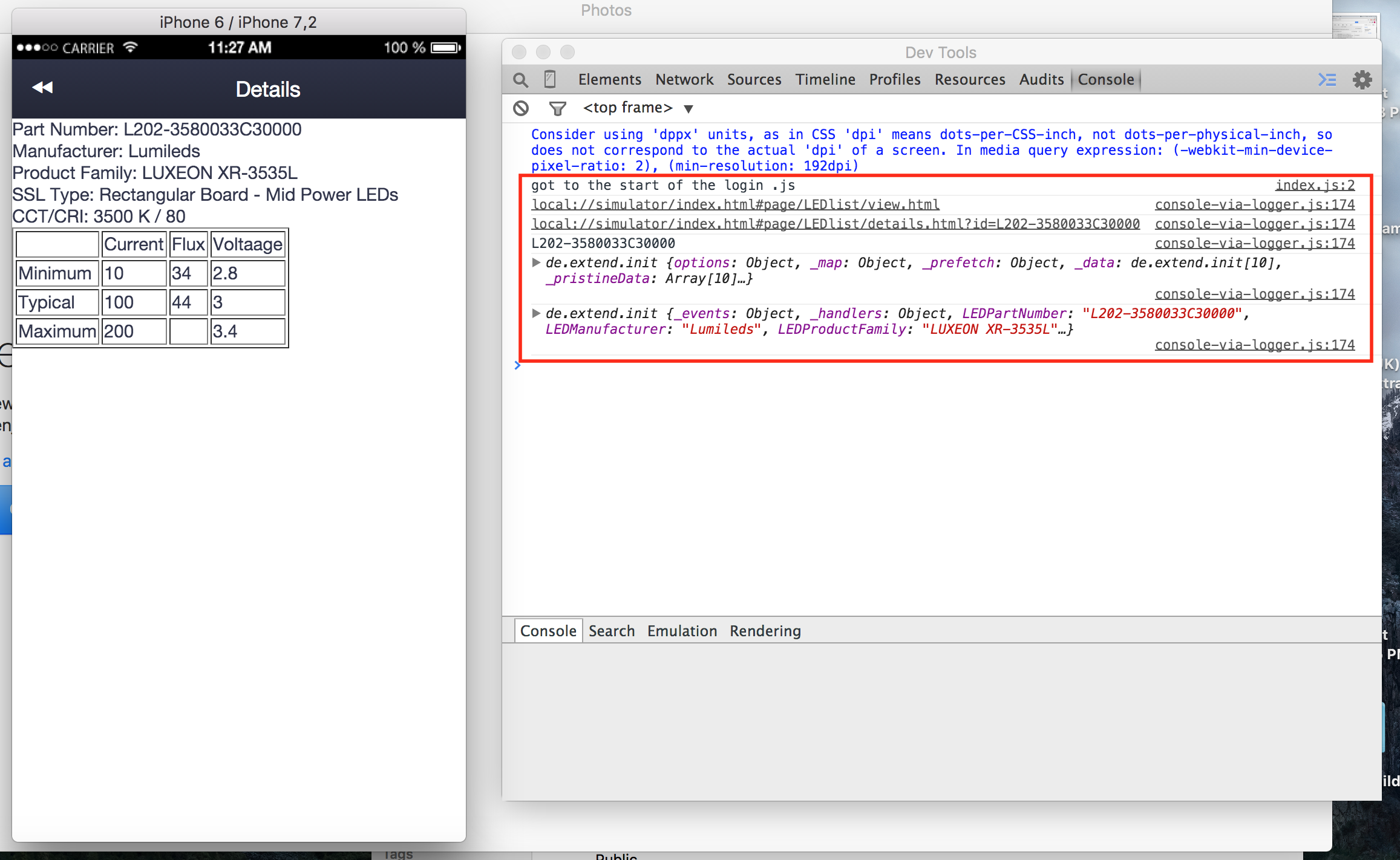 onShow: function (e) { var partNumber = e.view.params.id; app.data.one("change", function() { currentLED = app.data.view()[0]; var led = { /* ... */ }; kendo.bind($('#LEDContent'), led, kendo.mobile.ui); }); app.data.filter({ field: "LEDPartNumber", operator: "eq", value: partNumber });}4. on a side note <div>'s cannot be placed inside <a>'s, consider using different markup with inline elements instead of <div>'s