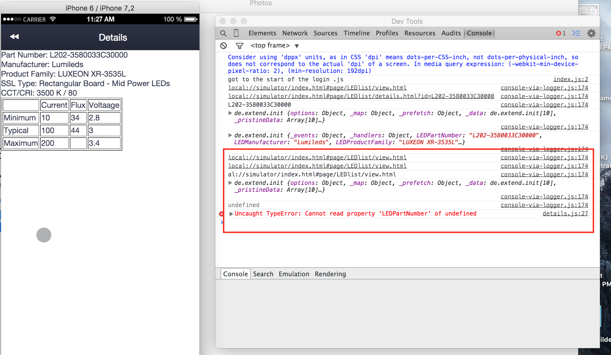 The problem is caused by the code in detail.js. It relies on the page URL to have changed when the Details view is displayed, but this is not always the case. As a result, the partNumber retrieval fails, then the filtering fails, and finally, the led object construction fails.
