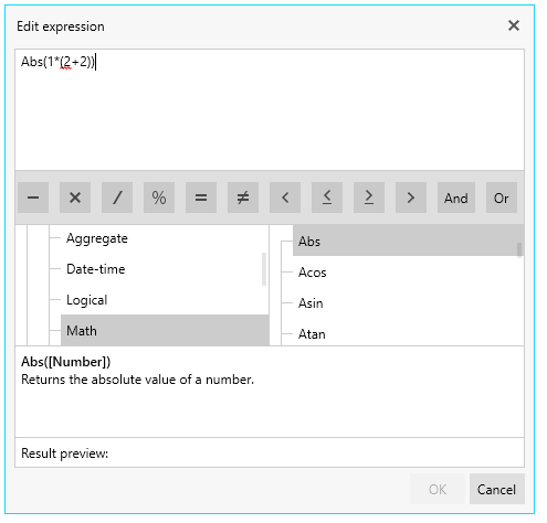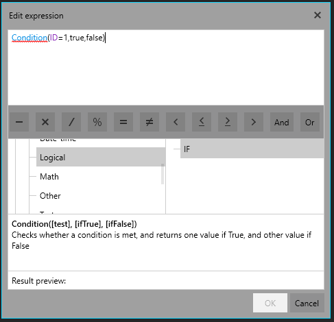 There also appears to be an issue with the way the "IF" function is added to the editor's text box when the function name is double-clicked. If you click on the IF function, the description below shows "Condition" instead of "IF" and if you double-click to add the function to add it to the expression the function that gets added is "Condition", which is invalid. The function should be IF, which works. Please see the attached screenshot from the R1 2019 WPF demo.