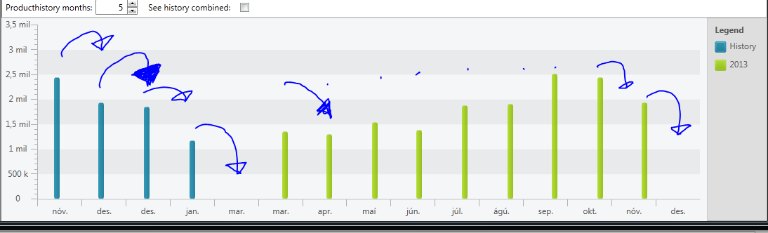 private DataSeries createDataSeries(List<ChartData> data, string legendLabel = "") { DataSeries series = new DataSeries(); BarSeriesDefinition definition = new BarSeriesDefinition(); definition.ShowItemToolTips = true; definition.ShowItemLabels = false; series.Definition = definition; series.LegendLabel = legendLabel; foreach (ChartData item in data) { DataPoint dataPoint = new DataPoint(); dataPoint.YValue = item.Value; dataPoint.XValue = item.Caption.ToOADate(); dataPoint.IsDateTime = true; dataPoint.LabelFormat = "MMM"; series.Add(dataPoint); count++; } return series; }Can you help me you ?