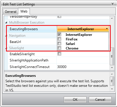 Sorry for causing you difficulty, my version of telerik test studio is 2011.1.502.0, there is no MultiBrowser Execution selection in Edit Test List Settings. Every time i just selected one kind of browsers for a list. yet i do not upgrade it, cause i have configured some PC to schedule test run, it is not convenient to upgrade all the PC since test studio does not support well between different versions, and my code of test may need to be updated if i upgrade it. see my attachment.