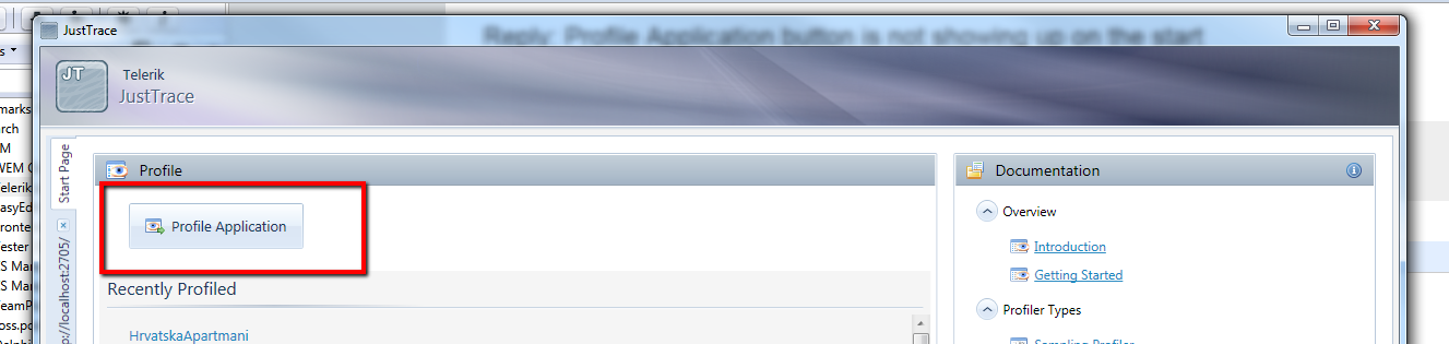 This button is not on Visual Studio start page, instead you have to start Telerik.JustTrace.exe and there is Profile Application button.