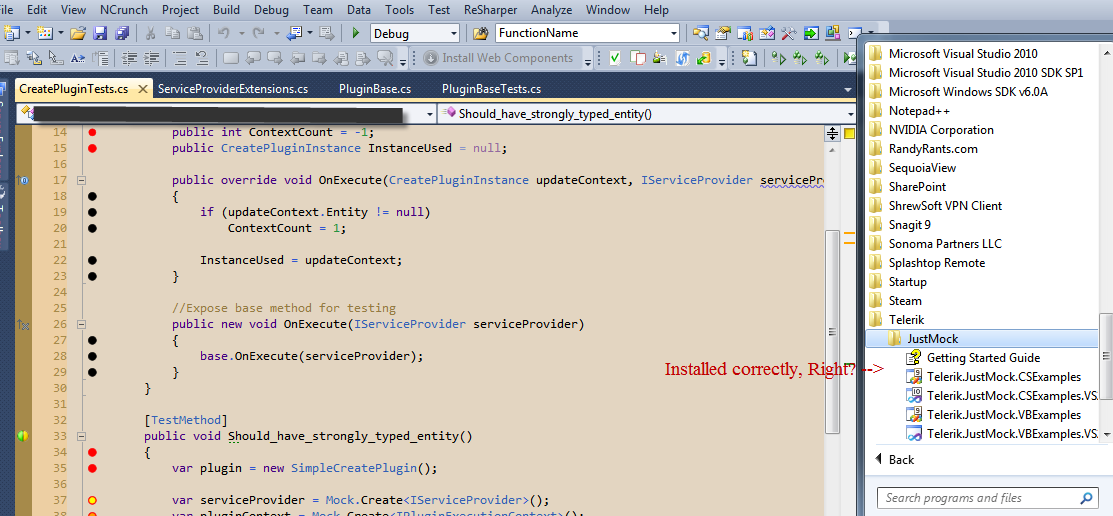 Is there supposed to be a JustMock menu? Button? Dancing bear? I've attached a screenshot, please diagnose what's going on. I've