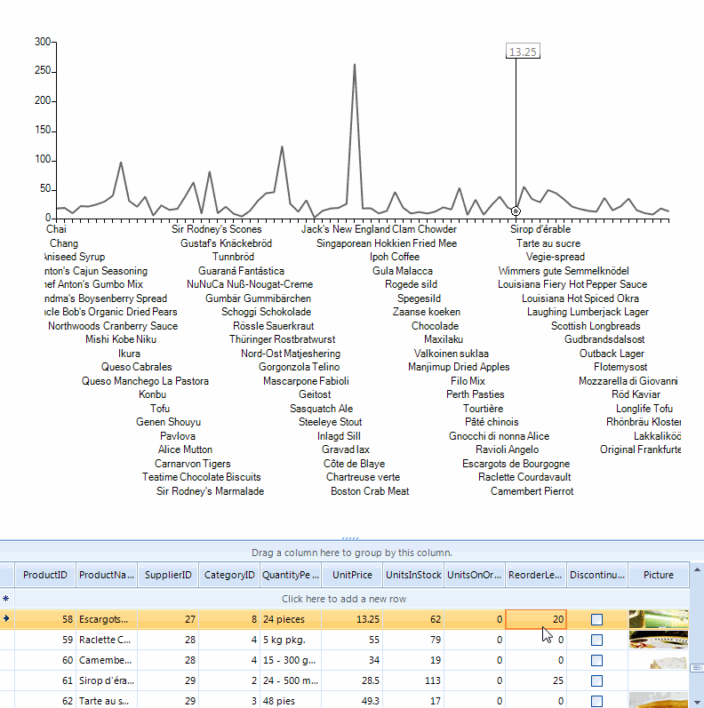 private void Form1_Load(object sender, EventArgs e){ this.productsTableAdapter.Fill(this.nwindDataSet.Products); this.radGridView1.DataSource = this.productsBindingSource; this.radGridView1.AutoSizeColumnsMode = GridViewAutoSizeColumnsMode.Fill; LineSeries lineSeria = new LineSeries(); radChartView1.Series.Add(lineSeria); lineSeria.ValueMember = "UnitPrice"; lineSeria.CategoryMember = "ProductName"; lineSeria.DataSource = this.productsBindingSource; CategoricalAxis horizontalAxis = lineSeria.HorizontalAxis as CategoricalAxis; if (horizontalAxis != null) { horizontalAxis.LabelFitMode = AxisLabelFitMode.MultiLine; } trackBallController = new CustomChartTrackballController(); radChartView1.Controllers.Add(trackBallController); this.radGridView1.CurrentRowChanged += radGridView1_CurrentRowChanged;}private void radGridView1_CurrentRowChanged(object sender, CurrentRowChangedEventArgs e){ if (e.CurrentRow != null && e.CurrentRow.Index>-1) { CategoricalDataPoint point = this.radChartView1.Series[0].DataPoints[e.CurrentRow.Index] as CategoricalDataPoint; trackBallController.MoveTrackballToCoordinates(new PointF((float)point.LayoutSlot.Location.X, (float)point.LayoutSlot.Location.Y)); this.radChartView1.Invalidate(); }}CustomChartTrackballController trackBallController = null;public class CustomChartTrackballController : ChartTrackballController{ public void MoveTrackballToCoordinates(PointF point) { this.MoveTrackball(point); }}I hope this information helps. Should you have further questions I would be glad to help.