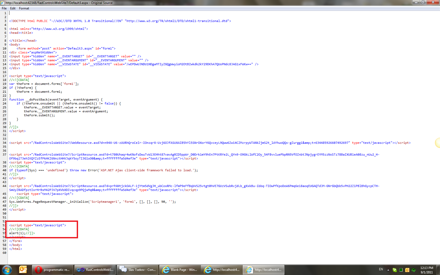 Please note that the ScriptManager.RegisterStartupScript() method outputs the provided script as a direct child of the form element (at its end, as you can see in the attached screenshot) and is thus not connected to the RadDock.