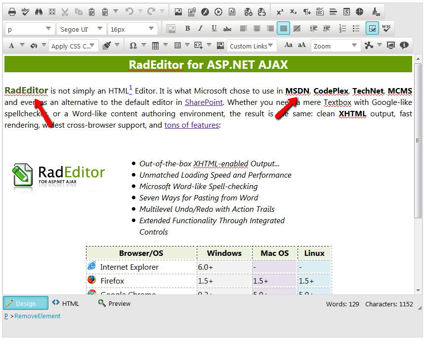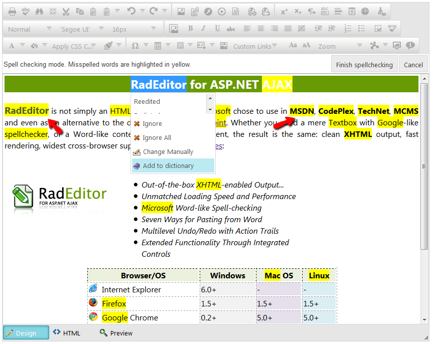 I suppose the mentioned squiggles comes from the browser's spell checking feature. I am attaching two snapshots, one with the browser's spell check highlighting and one with the editor's. Please compare them and get back to me if I am somehow mislead to the origin of your problem.