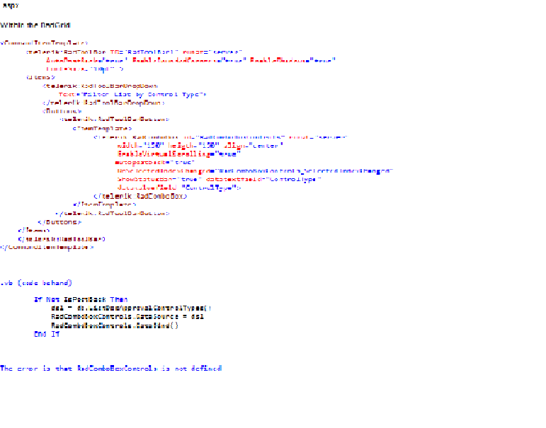 Update - I attempted to add a data bound RadComboBox to the RadToolBar using the itemTemplate. I think that this should be able to be done, however this was not successful. If this is able to be done, this will resolve my issue. Code attached. If anyone can point me in the right direction, it was be greatly appreciated.