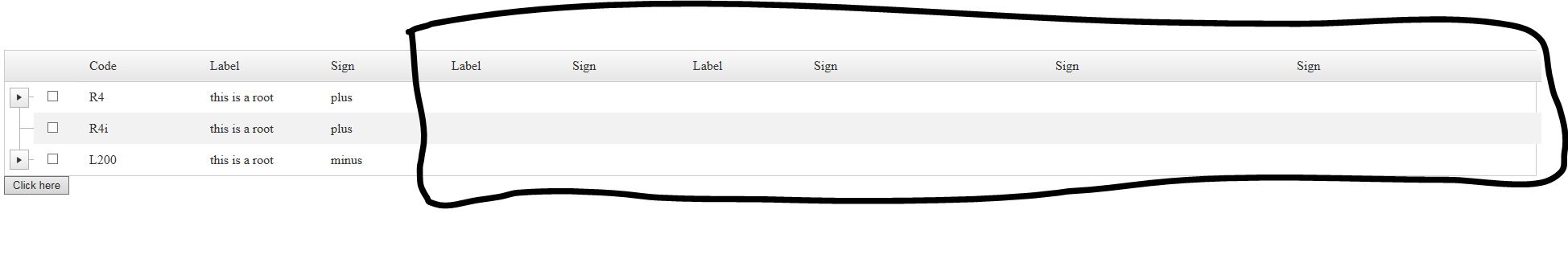 namespace TelerikTreeListGhostColumnIssue{ public partial class TreeListControl : System.Web.UI.UserControl { public List<CategoryItem> CategoryItems = new List<CategoryItem>() { new CategoryItem(1, 0, "R4", "this is a root", "plus"), new CategoryItem(2, 1, "R1", "child 1", "minus"), new CategoryItem(3, 1, "R2", "child 2", "minus"), new CategoryItem(4, 0, "R4i", "this is a root", "plus"), new CategoryItem(5, 0, "L200", "this is a root", "minus"), new CategoryItem(6, 5, "L100", "child 1", "plus"), new CategoryItem(7, 5, "L101", "child 2", "minus"), new CategoryItem(8, 5, "L102", "child 3", "plus"), new CategoryItem(9, 5, "L103", "child 4", "minus"), }; protected void Page_Init(object sender, EventArgs e) { List<ComboBoxColumn> columns = GetExtendedViewColumns(); foreach (var column in columns) WindowGrid.Columns.Add(GetGridColumnFromComboBoxColumn(column)); } protected void WindowGrid_NeedDataSource(object sender, Telerik.Web.UI.TreeListNeedDataSourceEventArgs e) { WindowGrid.DataSource = CategoryItems; } protected List<ComboBoxColumn> GetExtendedViewColumns() { var columns = new List<ComboBoxColumn>(); columns.Add(new ComboBoxColumn() { Title = "Code", ColumnType = ComboBoxColumn.CBColumnType.Text, DataPropertyName = "Code" }); columns.Add(new ComboBoxColumn() { Title = "Label", ColumnType = ComboBoxColumn.CBColumnType.Text, DataPropertyName = "Label" }); columns.Add(new ComboBoxColumn() { Title = "Sign", ColumnType = ComboBoxColumn.CBColumnType.Text, DataPropertyName = "Sign" }); return columns; } private TreeListEditableColumn GetGridColumnFromComboBoxColumn(ComboBoxColumn column) { switch (column.ColumnType) { case CBColumnType.Text: var gridBoundColumn = new TreeListBoundColumn(); gridBoundColumn.DataField = column.DataPropertyName; gridBoundColumn.HeaderStyle.Width = new System.Web.UI.WebControls.Unit(150); gridBoundColumn.HeaderText = column.Title; return gridBoundColumn; case CBColumnType.Checkbox: var gridCheckBoxColumn = new TreeListCheckBoxColumn(); gridCheckBoxColumn.DataField = column.DataPropertyName; gridCheckBoxColumn.HeaderStyle.Width = new System.Web.UI.WebControls.Unit(100); gridCheckBoxColumn.HeaderText = column.Title; return gridCheckBoxColumn; default: throw new NotImplementedException(); } } }}