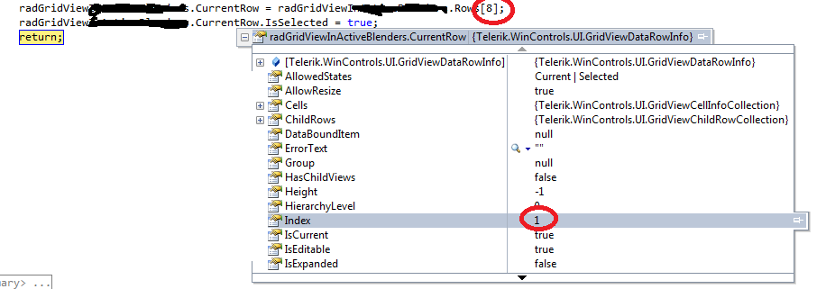 this.radGridView1.CurrentRow = this.radGridView1.Rows[0];if (this.radGridView1.CurrentRow != null){ this.radGridView1.CurrentRow.IsSelected = true;}If you have more questions, do not hesitate to contact us.