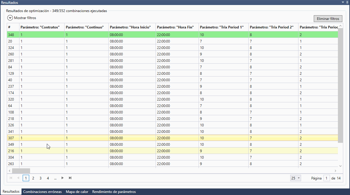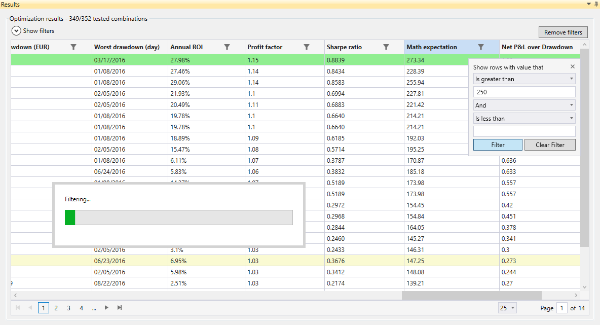 01.<telerik:RadGridView Grid.Row="1" Name="DatagridResults" FilterOperatorsLoading="DatagridResults_OnFilterOperatorsLoading" Filtering="DatagridResults_OnFiltering" Filtered="DatagridResults_OnFiltered" ItemsSource="{Binding OptimizerResults}" helpers1:BarLogColumnsBindingBehavior.Columns="{Binding ResultsOptimizerColumns}" Loaded="DatagridResults_OnLoaded" MouseDoubleClick="ResultsOnMouseDoubleClick" Sorting="DatagridResults_OnSorting" Sorted="DatagridResults_OnSorted" ShouldCloseFilteringPopupOnKeyboardFocusChanged="True" IsReadOnly="True" ShowGroupPanel="False" CanUserDeleteRows="False" CanUserInsertRows="False" AreRowDetailsFrozen="True" CanUserReorderColumns="False" CanUserResizeRows="False" CanUserResizeColumns="False" RowIndicatorVisibility="Collapsed" IsFilteringAllowed="True" EnableColumnVirtualization="False" FrozenColumnsSplitterVisibility="Collapsed">02. <telerik:RadContextMenu.ContextMenu>03. <telerik:RadContextMenu telerik:StyleManager.Theme="Windows7" ItemsSource="{Binding MenuItemContextMenuItemsCollection}" >04. <telerik:RadContextMenu.ItemContainerStyle>05. <Style TargetType="telerik:RadMenuItem">06. <Setter Property="IsCheckable" Value="True"/>07. <Setter Property="IsChecked" Value="{Binding IsChecked}"/>08. <Setter Property="Command" Value="{Binding Command}"/>09. <Setter Property="Header" Value="{Binding Header}"/>10. <Setter Property="CommandParameter" Value="{Binding RelativeSource={RelativeSource Self}}" />11. </Style>12. </telerik:RadContextMenu.ItemContainerStyle>13. </telerik:RadContextMenu>14. </telerik:RadContextMenu.ContextMenu>15. <telerik:RadGridView.Resources>16. <Style TargetType="telerik:GridViewRow">17. <Style.Triggers>18. <DataTrigger Binding="{Binding Color}" Value="Green">19. <DataTrigger.Setters>20. <Setter Property="Background" Value="LightGreen" />21. </DataTrigger.Setters>22. </DataTrigger>23. <DataTrigger Binding="{Binding Color}" Value="Yellow">24. <DataTrigger.Setters>25. <Setter Property="Background" Value="LightGoldenrodYellow" />26. </DataTrigger.Setters>27. </DataTrigger>28. <DataTrigger Binding="{Binding Color}" Value="White">29. <DataTrigger.Setters>30. <Setter Property="Background" Value="White" />31. </DataTrigger.Setters>32. </DataTrigger>33. </Style.Triggers>34. </Style>35. </telerik:RadGridView.Resources>36.</telerik:RadGridView>