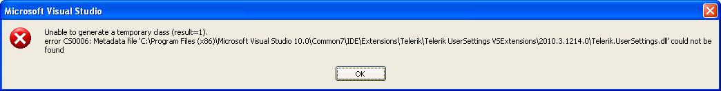error CS006: Metadata file 'C:\Program Files (x86)\Microsoft Visual Studio 10.0\Common7\IDE\Extensions\Telerik\Telerik UserSettings VSExtensions\2010.3.1214.0\Telerik.UserSettings.dll' could not be found"
