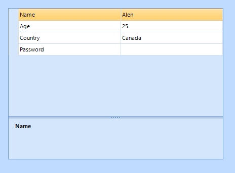 private void radPropertyGrid1_ItemFormatting(object sender, PropertyGridItemFormattingEventArgs e){ PropertyGridItem item = e.Item as PropertyGridItem; if (item != null && item.Name == "Password") { StringBuilder text = new StringBuilder(); if (!string.IsNullOrEmpty(item.FormattedValue)) { for (int i = 0; i < item.FormattedValue.Length; i++) { text.Append('*'); } } ((PropertyGridItemElement)e.VisualElement).ValueElement.Text = text.ToString(); }}I hope this will help. If you need further assistance, feel free to write back.