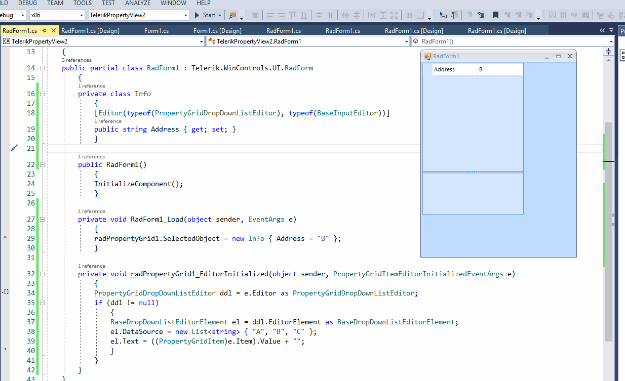 public partial class RadForm1 : Telerik.WinControls.UI.RadForm { private class Info { [Editor(typeof(PropertyGridDropDownListEditor), typeof(BaseInputEditor))] public string Address { get; set; } } public RadForm1() { InitializeComponent(); } private void RadForm1_Load(object sender, EventArgs e) { radPropertyGrid1.SelectedObject = new Info { Address = "B" }; } private void radPropertyGrid1_EditorInitialized(object sender, PropertyGridItemEditorInitializedEventArgs e) { PropertyGridDropDownListEditor ddl = e.Editor as PropertyGridDropDownListEditor; if (ddl != null) { BaseDropDownListEditorElement el = ddl.EditorElement as BaseDropDownListEditorElement; el.DataSource = new List<string> { "A", "B", "C" }; el.Text = ((PropertyGridItem)e.Item).Value + ""; } } }