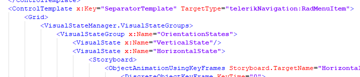 <Window.Resources> <ControlTemplate x:Key="SeparatorTemplate" TargetType="telerik:RadMenuItem"> <Grid HorizontalAlignment="Stretch"> <Rectangle Fill="Red" Height="20" Width="1" VerticalAlignment="Stretch"/> <Rectangle Fill="Blue" Height="20" Width="1" VerticalAlignment="Stretch"/> </Grid> </ControlTemplate> </Window.Resources> <Grid x:Name="LayoutRoot" Background="White"> <telerik:RadMenu x:Name="radMenu" ClickToOpen="False" VerticalAlignment="Top" HorizontalAlignment="Left" Margin="8,8,0,0"> <telerik:RadMenuItem Header="File"/> <telerik:RadMenuItem Header="Edit" IsSeparator="True" Template="{StaticResource SeparatorTemplate}" /> <telerik:RadMenuItem Header="View" /> </telerik:RadMenu> </Grid>
