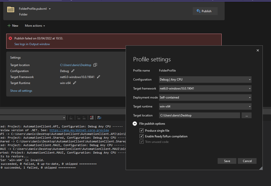03/04/2022 10:45:16 System.AggregateException: One or more errors occurred. ---> Microsoft.WebTools.Shared.Exceptions.WebToolsException: Publish has encountered an error. We were unable to determine the cause of the error. Check the output log for more details. --- End of inner exception stack trace --- ---> (Inner Exception #0) Microsoft.WebTools.Shared.Exceptions.WebToolsException: Publish has encountered an error. We were unable to determine the cause of the error. Check the output log for more details. <--- Microsoft.WebTools.Shared.Exceptions.WebToolsException: Publish has encountered an error. We were unable to determine the cause of the error. Check the output log for more details. ===================