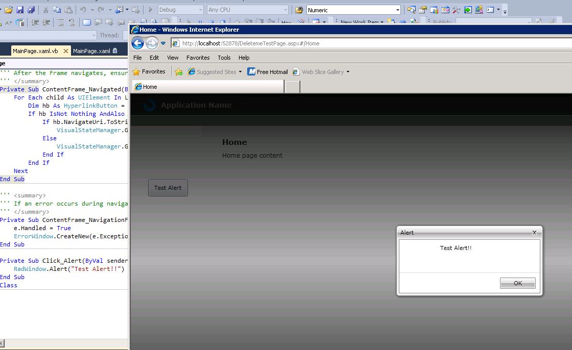 I create a new project using the standard microsoft Business Application Template and simply added a button to the home page. The code for the click event on the button is: radwindow.alert("Test Alert!!").