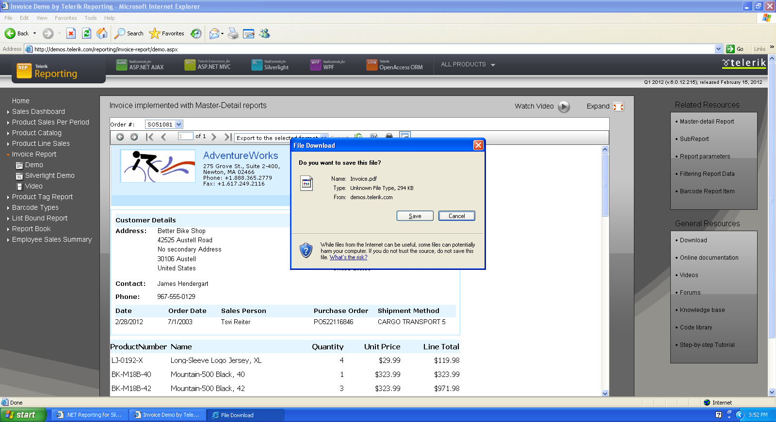 When trying to print a report (also occurs on demo site: http://demos.telerik.com/reporting/invoice-report/demo.aspx) in IE 7 browser, the user is prompted to save the PDF instead of being presented with the printer object window.