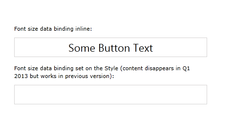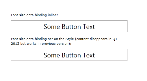 <UserControl x:Class="SilverlightApplication1.MainPage03" xmlns:local="clr-namespace:SilverlightApplication1" xmlns:telerik="http://schemas.telerik.com/2008/xaml/presentation" d:DesignHeight="300" d:DesignWidth="400" mc:Ignorable="d"> <UserControl.Resources> <local:DataContainer x:Key="DataContainer"> </local:DataContainer> <Style x:Name="Style_DataBoundFontSize" TargetType="telerik:RadButton"> <Setter Property="FontSize" Value="{Binding TheFontSize, Source={StaticResource DataContainer}}" /> </Style> </UserControl.Resources> <Grid x:Name="LayoutRoot" Background="White"> <StackPanel Width="400" Margin="0 50 0 0"> <TextBlock Margin="5">Font size data binding inline:</TextBlock> <telerik:RadButton Height="40" Margin="5 5 0 10" Content="Some Button Text" FontSize="{Binding TheFontSize, Source={StaticResource DataContainer}}"> </telerik:RadButton> <TextBlock Margin="5" TextWrapping="Wrap"> Font size data binding set on the Style (content disappears in Q1 2013 but works in previous version): </TextBlock> <telerik:RadButton Height="40" Margin="5 5 0 10" Content="Some Button Text" Style="{StaticResource Style_DataBoundFontSize}"> </telerik:RadButton> </StackPanel> </Grid></UserControl>Code-behind: