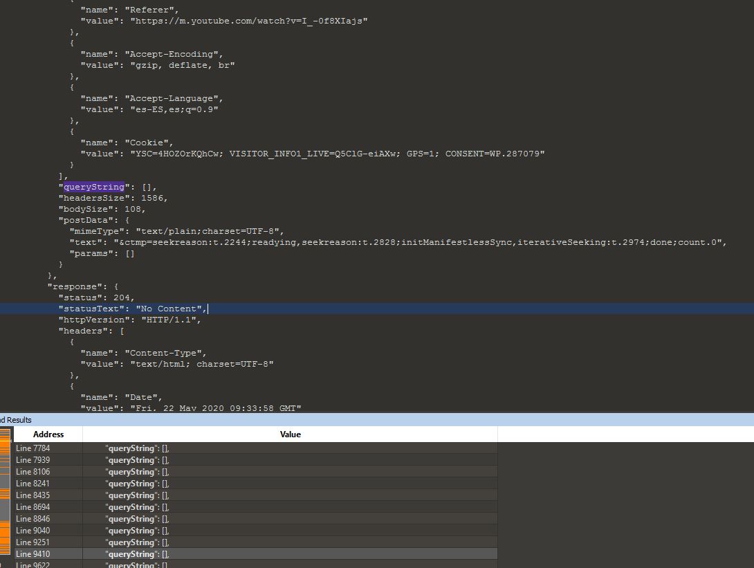 I am sniffing and capturing HTTPS traffic generated by selenium + chromedriver on YouTube. For testing purposes, I export each test as a HAR file to examine its content.