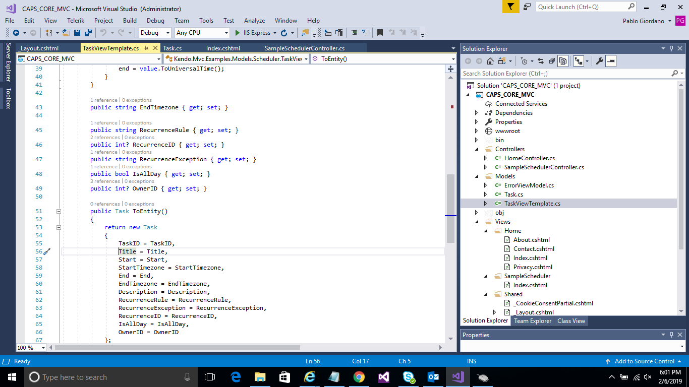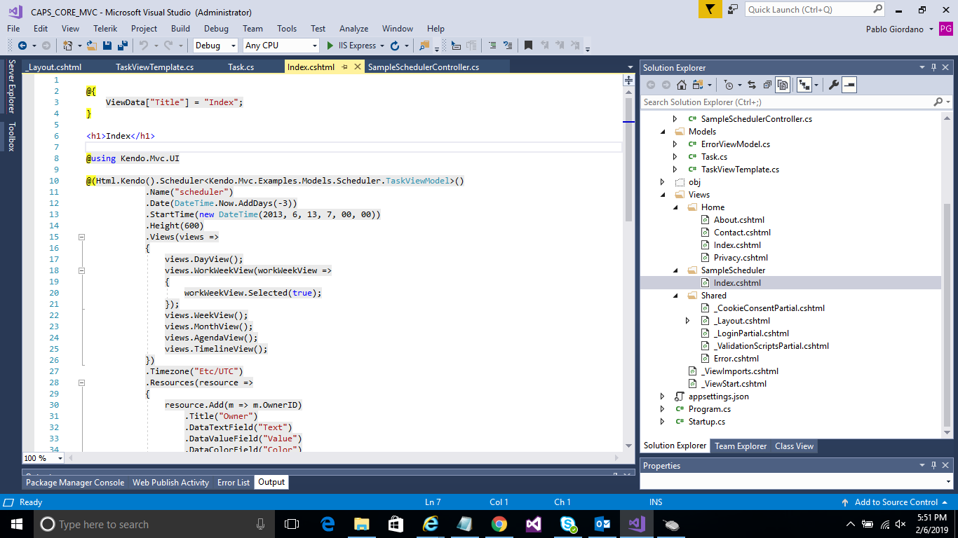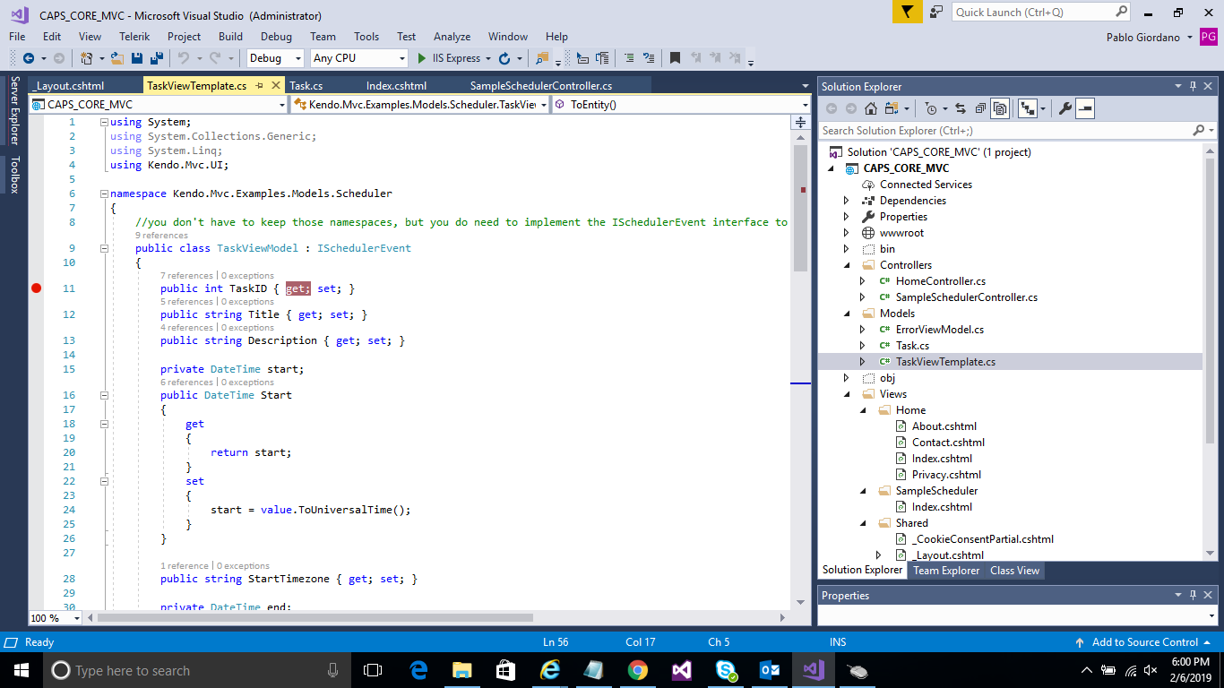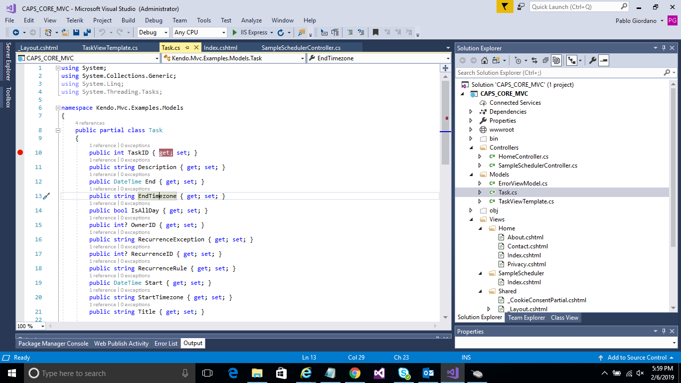 But when I copy the code from your demo I get an error in: @(Html.Kendo().Scheduler<Kendo.Mvc.Examples.Models.Scheduler.TaskViewModel>()