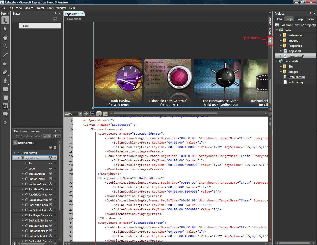 How come if you load Labs.Telerik sample into Blend, Blend does/can not show the storyboards created in the Page.xaml?