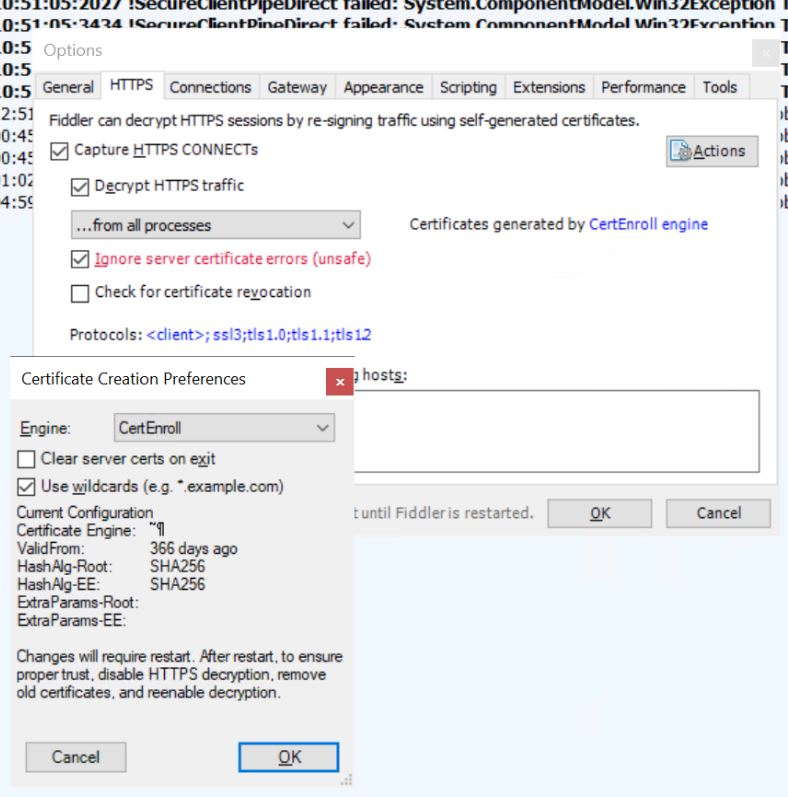 I built a cloud server and installed Fiddler and set it up to decrypt HTTPS then configured a bunch of devices to accept the certificate and everything was fine. Once finished my testing since cloud servers cost money and I didn't wanna pay for it while idle I created an image and deleted the server in hopes next time I would have all the configuration and it seemed to work fine. I recreated the server from the image a bunch of times and every time I was able to connect the devices and do my testing no problem... well, until today when I just did the same again and I'm getting the … "!SecureClientPipeDirect failed: System.ComponentModel.Win32Exception The credentials supplied to the package were not recognized for pipe (CN=*.somerandomdomain.com, O=DO_NOT_TRUST, OU=Created by http://www.fiddler2.com)" .. which basically means if I'm correct I need to generate a new certificate which then I need to install in all the clients :-\ .. I tried just downloading the certificate again from the fiddler proxy URL but it is the same of course and if I do a binary compare using "fc.exe /b" I can confirm they're identical so it seems my only way would be to generate a new one … before I give up to that, is there anything else I could do to avoid having to do it? my main issue is I don't have all the devices on hand and now I'd have to reach to every user and explain one by one how to do this and some of them are not that tech savvy :-(
