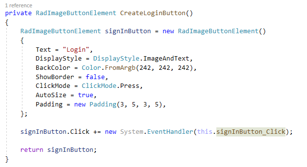 I have a RadForm. I added a RadImageButtonElement (CreatingButton.png) to the Title Bar of it because I want to add a Login type of button.