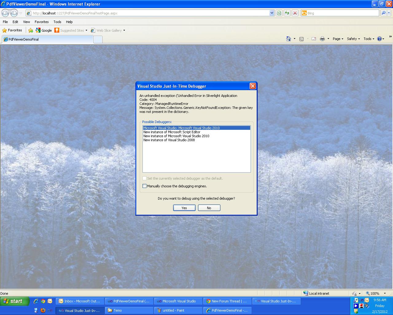 We will check if there is an issue when the PdfViewer is used in an application run on Windows XP.1. Silverlight does not support silent printing. The print dialog should be user initiated or the application will throw a SecurityException. More info about the printing in Silverlight you can find here.