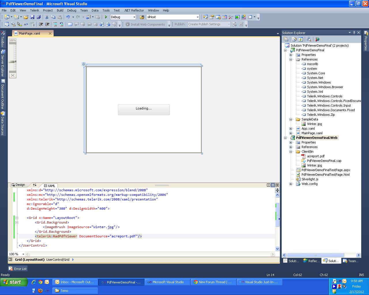 2. Please find attached a project that is mostly the same as our online demo. You should be able to run it when you fix the references to the latest 2012.1.215 release (if needed).