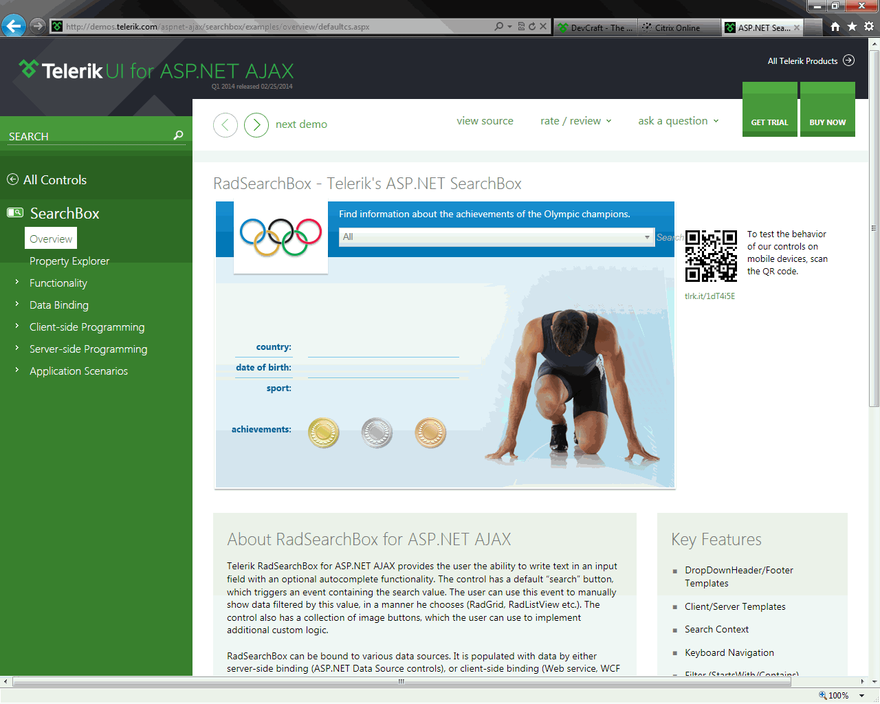 There is an odd behavior only in IE 9, where the SearchContext combo expands to fill the entire search box. The search text and icon are then shifted to the far right. This happens when you first hover over the search box, and only in IE 9. Firefox, IE 8, 10 and 11 do not exhibit this behavior. You can see the result of this behavior in the two attached files: Quirky.gif (see aspx source below), and from the Telerik Demo page.