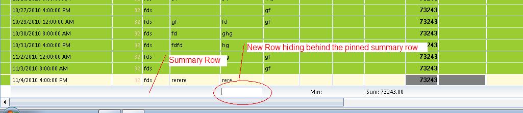 The summary is row is getting pinned but when I have the records in the grid fill the entire grid, the new row added is hiding behind the pinned summary row.