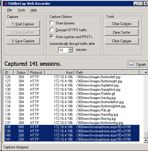 Once you save the log produced by FiddlerCap you can use Fiddler to open it. Inside the log you will find an entry for each request. Please select one of the failing requests and post here its content.