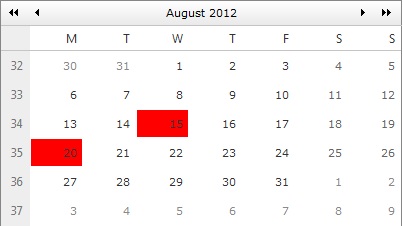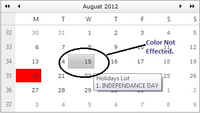 In my project i used Rad Calender Control for display a specific dates in a different formats, eg: i want to display a national holidays in a calender with LightSkyBlue color.
