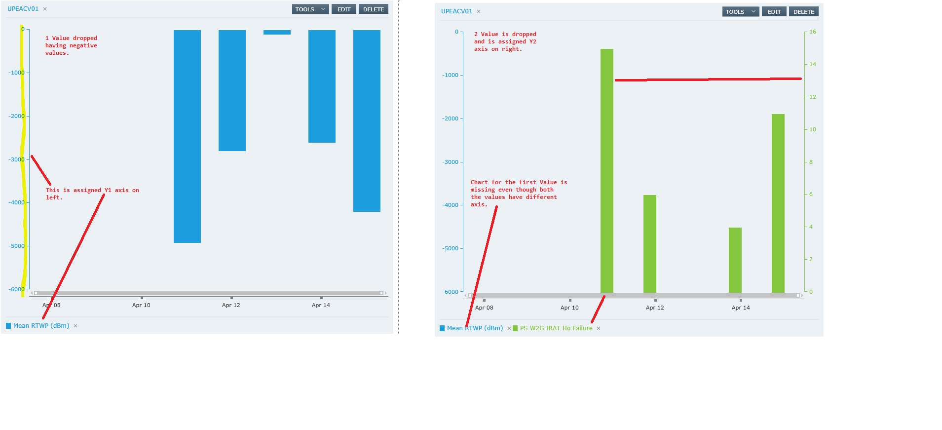 I have dropped KPI with negative value first and chart is created. But as soon as I drop second KPI on the chart, albeit it is assigned different Y axis (Y2), the