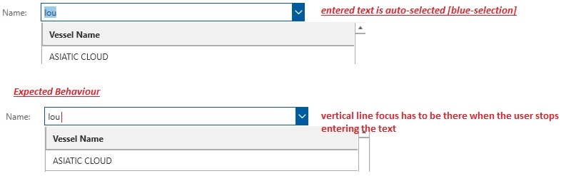 We found that as soon as the user stops entering the Alphabet, the control selects the whole Alphabets already entered(Blue Selection). - which should not and the user have to press the Right Arrow to get the focus to the last alphabet to add more alphabet the existing text.