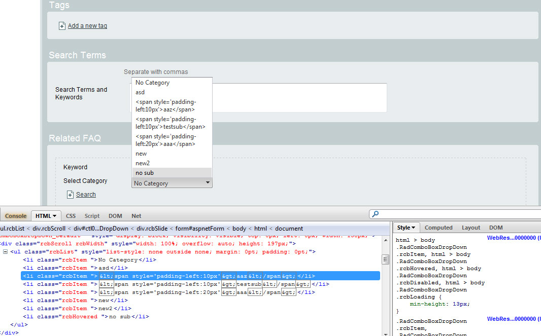 protected void Page_Load(object sender, EventArgs e) { RadComboBox4.DataSource = CreateDataSource(); RadComboBox4.DataTextField = "Name"; RadComboBox4.DataValueField = "ID"; RadComboBox4.DataBind(); }protected DataTable CreateDataSource() { DataTable dataTable = new DataTable(); dataTable.Columns.Add(new DataColumn("ID", typeof(string))); dataTable.Columns.Add(new DataColumn("Name", typeof(string))); DataRow dr = dataTable.NewRow(); dr["ID"] = "1"; dr["Name"] = "name1"; dataTable.Rows.Add(dr); DataRow dr2 = dataTable.NewRow(); dr2["ID"] = "2"; dr2["Name"] = "<b>name1</b>"; dataTable.Rows.Add(dr2); DataRow dr3 = dataTable.NewRow(); dr3["ID"] = "3"; dr3["Name"] = "<span style='padding-left:20px'>name3</span>"; dataTable.Rows.Add(dr3); return dataTable; }Please go through the above code and check whether you missed anything. Please feel to share the comments.