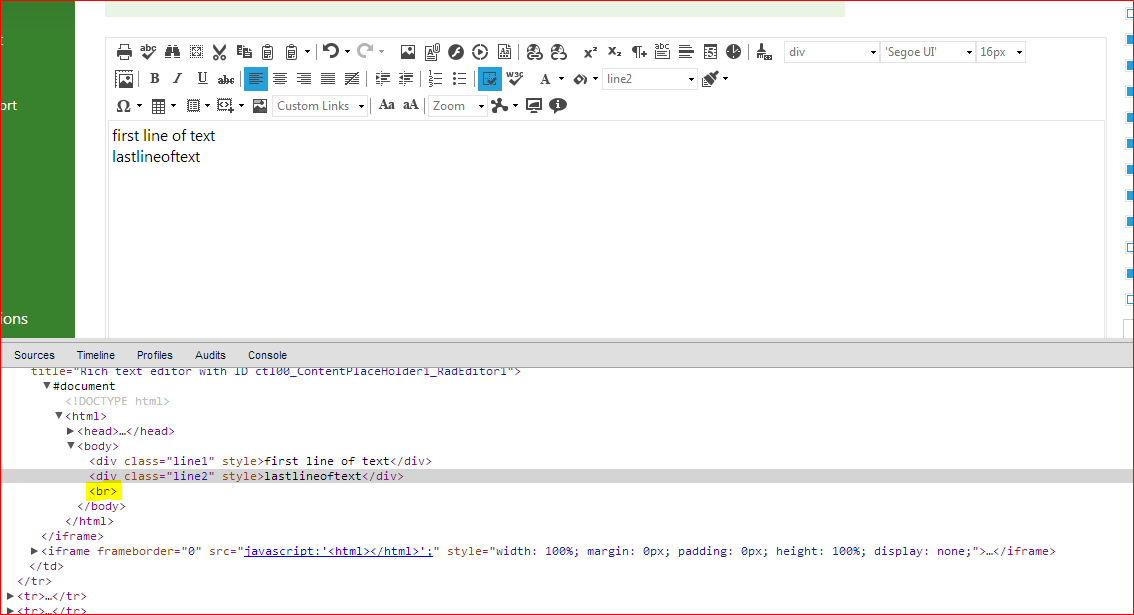 Also I would like to point out that this element is not inserted with the RadEditor's logic. As you should be aware the editor is an editable iframe element, and as one, Chrome and Firefox adds this <br> for the reasons mentioned above. For the convenience of the users, the ConvertToXhtml removes it when switched to HTML mode and retrieves it back in - Design.
