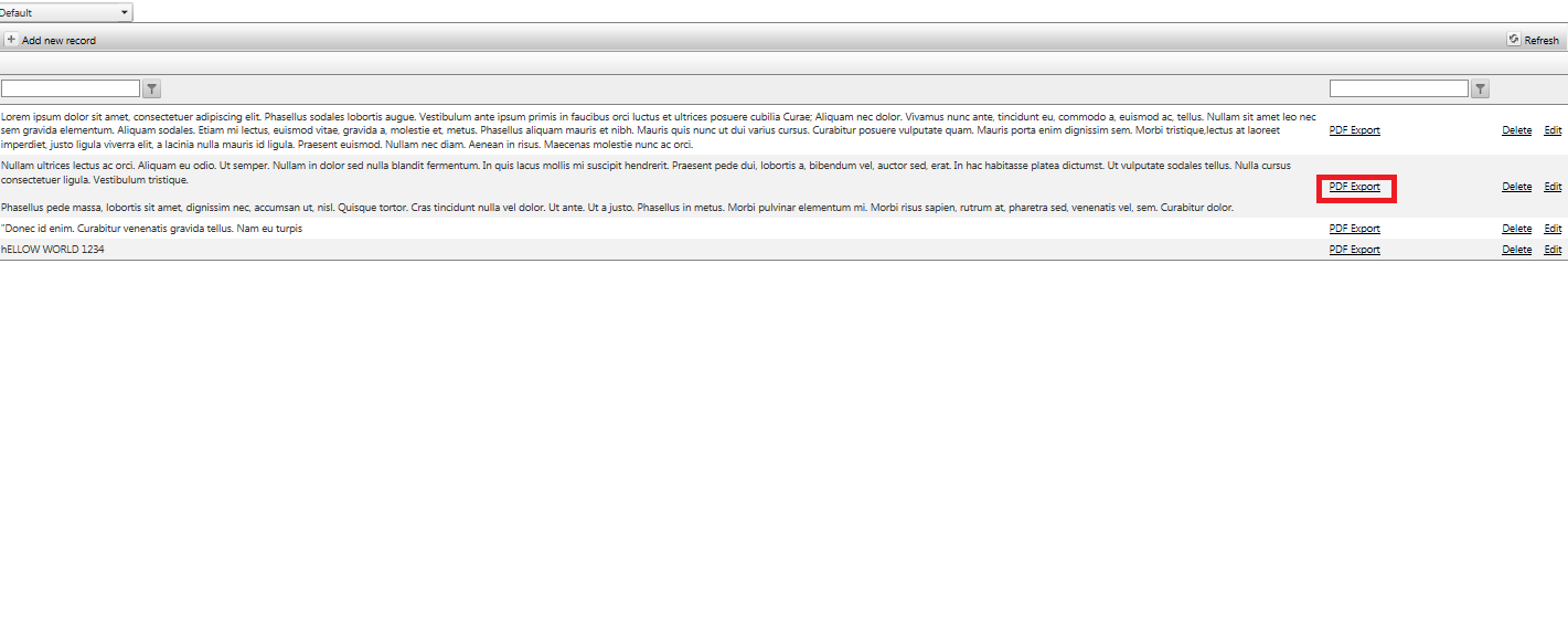 ______________<form id="form1" runat="server"> <telerik:RadScriptManager runat="server" ID="RadScriptManager1" /> <telerik:RadSkinManager ID="QsfSkinManager" runat="server" ShowChooser="true" /> <telerik:RadFormDecorator ID="QsfFromDecorator" runat="server" DecoratedControls="All" EnableRoundedCorners="false" /> <telerik:RadGrid ID="MyDataGrid" runat="server" AutoGenerateColumns="False" DataSourceID="SqlDataSource1" AllowAutomaticUpdates="True" AllowAutomaticDeletes="True" AllowAutomaticInserts="True" AutoGenerateEditColumn="True" AutoGenerateDeleteColumn="True" CellSpacing="0" GridLines="None" AllowFilteringByColumn="True" AllowSorting="True"> <ClientSettings> <Selecting AllowRowSelect="True" /> </ClientSettings> <MasterTableView DataKeyNames="ID" CommandItemDisplay="Top"> <CommandItemSettings ExportToPdfText="Export to PDF"></CommandItemSettings> <RowIndicatorColumn Visible="True" FilterControlAltText="Filter RowIndicator column"> </RowIndicatorColumn> <ExpandCollapseColumn Visible="True" FilterControlAltText="Filter ExpandColumn column"> </ExpandCollapseColumn> <Columns> <telerik:GridTemplateColumn UniqueName="ID" Display="false"> <ItemTemplate> <asp:Label ID="IdLabel" runat="server" Text='<%# Eval("ID") %>'></asp:Label> </ItemTemplate> </telerik:GridTemplateColumn> <telerik:GridTemplateColumn UniqueName="Content"> <ItemTemplate> <asp:Label ID="lblField1" CssClass="text" runat="server" Text='<%# Eval("Content") %>'></asp:Label> </ItemTemplate> <EditItemTemplate> <telerik:RadEditor ID="RadEditorEdit" SkinID="DefaultSetOfTools" ContentFilters="DefaultFilters,PdfExportFilter" runat="server" content='<%# Bind("Content") %>'> <ExportSettings OpenInNewWindow="true"> </ExportSettings> </telerik:RadEditor> </EditItemTemplate> <InsertItemTemplate> <telerik:RadEditor ID="RadEditorEdit" runat="server" SkinID="DefaultSetOfTools" ContentFilters="DefaultFilters,PdfExportFilter" content='<%# Bind("Content") %>'> <ExportSettings OpenInNewWindow="true"> </ExportSettings> </telerik:RadEditor> </InsertItemTemplate> </telerik:GridTemplateColumn> <telerik:GridTemplateColumn UniqueName="Export"> <ItemTemplate> <asp:LinkButton ID="LinkButton1" OnClick="Button1_Click" runat="server" Text="PDF Export"></asp:LinkButton> </ItemTemplate> </telerik:GridTemplateColumn> </Columns> <EditFormSettings> <EditColumn FilterControlAltText="Filter EditCommandColumn column"> </EditColumn> </EditFormSettings> </MasterTableView> <FilterMenu EnableImageSprites="False"> </FilterMenu> </telerik:RadGrid> <asp:SqlDataSource ID="SqlDataSource1" runat="server" ConnectionString="<%$ ConnectionStrings:TelerikConnectionString2 %>" SelectCommand="SELECT [ID], [Content] FROM [BlogPosts]" UpdateCommand="UPDATE [BlogPosts] SET [Content] = @Content WHERE [ID] = @ID" DeleteCommand="DELETE FROM [BlogPosts] WHERE [ID] = @ID" InsertCommand="INSERT INTO [BlogPosts] ([PublishDate], [Category], [Title], [Content]) VALUES (GETDATE(), 'Foo', 'Bar',@Content)"> <DeleteParameters> <asp:Parameter Name="ID" Type="Int32"></asp:Parameter> </DeleteParameters> <InsertParameters> <asp:Parameter Name="Content" Type="String"></asp:Parameter> </InsertParameters> <UpdateParameters> <asp:Parameter Name="Content" Type="String"></asp:Parameter> <asp:Parameter Name="ID" Type="Int32"></asp:Parameter> </UpdateParameters> </asp:SqlDataSource> </form>