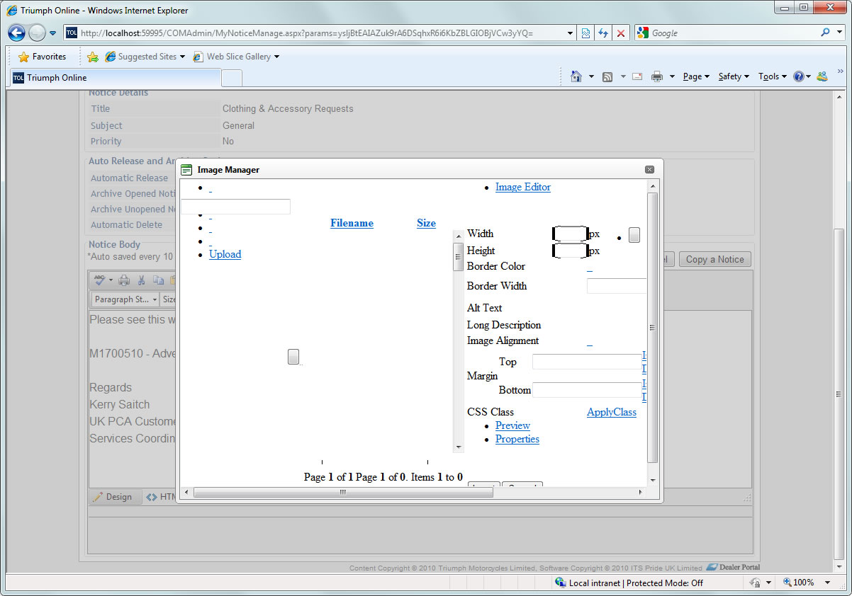 The RadEditor's dialogs are based on RadWindow which loads its contents inside an IFRAME. This is another document which does not inherit the css stylesheet of the parent page where the editor resides. To load the needed css classes in the dialogs you should set the DialogsCssFile to point to external css file which contains the stylesheet of the controls contained in the dialogs.