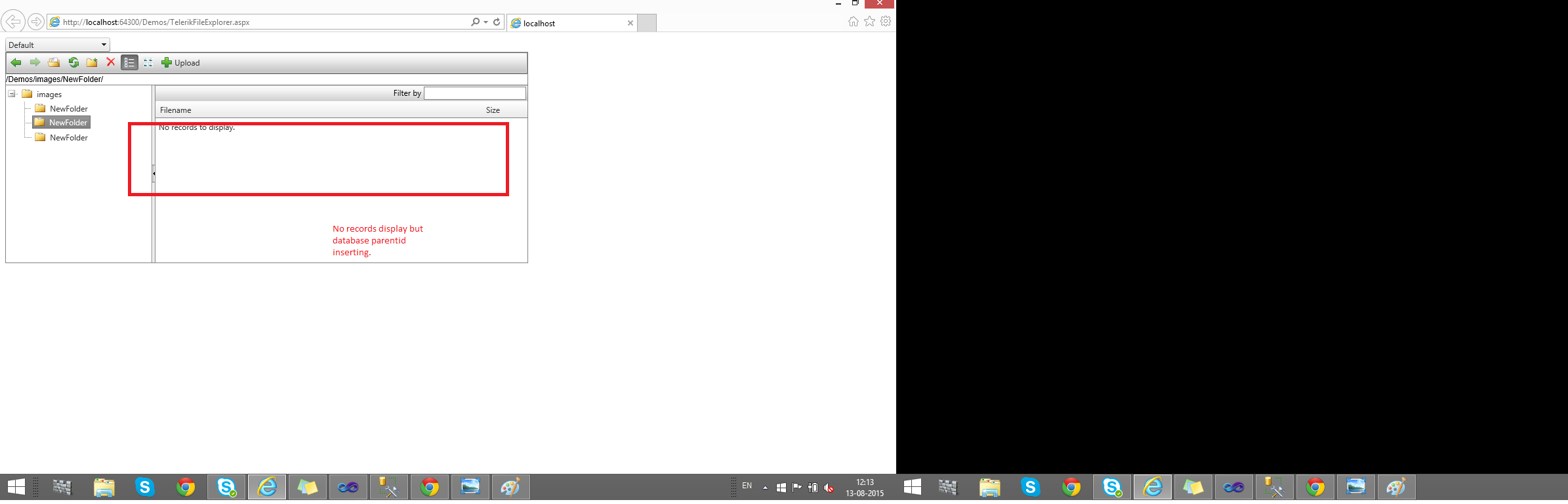 I have created sample application using Rad file explorer.Im storing values as bytes in database table when user click on the download im downloading the files. my problem in case Mainfolder the values are assigned directly from database no prblm but while create subfolder under the Mainfolder im facing problem in database the value is inserting but while bind the values not binding.