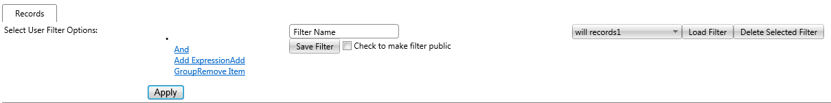 <telerik:RadAjaxManagerProxy ID="RadAjaxManagerProxy1" runat="server"> <AjaxSettings> <telerik:AjaxSetting AjaxControlID="RadFilter1"> <UpdatedControls> <telerik:AjaxUpdatedControl ControlID="RadFilter1" /> </UpdatedControls> </telerik:AjaxSetting> <telerik:AjaxSetting AjaxControlID="chk_FILTER_IS_PUBLIC"> <UpdatedControls> <telerik:AjaxUpdatedControl ControlID="chk_FILTER_IS_PUBLIC" /> </UpdatedControls> </telerik:AjaxSetting> <telerik:AjaxSetting AjaxControlID="btnSaveFilter"> <UpdatedControls> <telerik:AjaxUpdatedControl ControlID="btnSaveFilter" /> <telerik:AjaxUpdatedControl ControlID="ddl_FilterList" /> <telerik:AjaxUpdatedControl ControlID="txt_FILTER_NAME" /> <telerik:AjaxUpdatedControl ControlID="chk_FILTER_IS_PUBLIC" /> </UpdatedControls> </telerik:AjaxSetting> <telerik:AjaxSetting AjaxControlID="btnLoadFilter"> <UpdatedControls> <telerik:AjaxUpdatedControl ControlID="RadFilter1"></telerik:AjaxUpdatedControl> <telerik:AjaxUpdatedControl ControlID="btnLoadFilter" /> </UpdatedControls> </telerik:AjaxSetting> <telerik:AjaxSetting AjaxControlID="btnDeleteFilter"> <UpdatedControls> <telerik:AjaxUpdatedControl ControlID="btnDeleteFilter" /> <telerik:AjaxUpdatedControl ControlID="ddl_FilterList" /> </UpdatedControls> </telerik:AjaxSetting> </AjaxSettings> </telerik:RadAjaxManagerProxy><%--<asp:Panel runat="server" ID="pUSER_FILTERS" GroupingText="User Filters Control" Width="1240px" Visible="True">--%> <table width="1240"> <tr> <td align="left" valign="top" style="width: 200px"> <asp:Label ID="Label1" runat="server" Text="Select User Filter Options:"></asp:Label> </td> <td align="left" valign="top" style="width: 200px"> <telerik:RadFilter runat="server" ID="RadFilter1" ShowApplyButton="true" SettingsFormatter="BinaryFormatter" > </telerik:RadFilter> </td> <td align="left" valign="top" style="width: 400px"> <telerik:RadTextBox ID="txt_FILTER_NAME" runat="server" DisplayText="Filter Name" Style="float: left"> </telerik:RadTextBox> <telerik:RadButton ID="btnSaveFilter" runat="server" Text="Save Filter" Style="float: left"> </telerik:RadButton> <asp:CheckBox ID="chk_FILTER_IS_PUBLIC" runat="server" AutoPostBack="true" Text="Check to make filter public" Style="float: left" /> </td> <td align="left" valign="top" style="width: 400px"> <telerik:RadComboBox ID="ddl_FilterList" runat="server" Style="float: left"> </telerik:RadComboBox> <telerik:RadButton ID="btnLoadFilter" runat="server" Text="Load Filter" Style="float: left"> </telerik:RadButton> <telerik:RadButton ID="btnDeleteFilter" runat="server" Text="Delete Selected Filter" Style="float: left" OnClientClick="if(!confirm('Are you sure you want to delete this Filter?')) return false;"> </telerik:RadButton> </td> </tr> </table>0