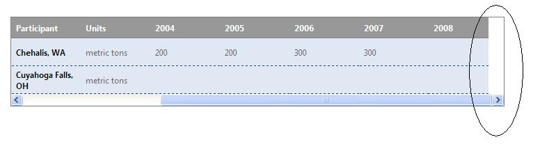 I am having grid in which first 2 columns are frozen.... and after that I am showing yearly data, could be for 1 - 12 (max 12 years data) years depending on user selection. If user selection is less than 12 years then hiding rest of the columns.... In the same grid I am having inline edit feature, so that user can add/edit values in same row.( I guess inline editing has nothing to do with this problem)