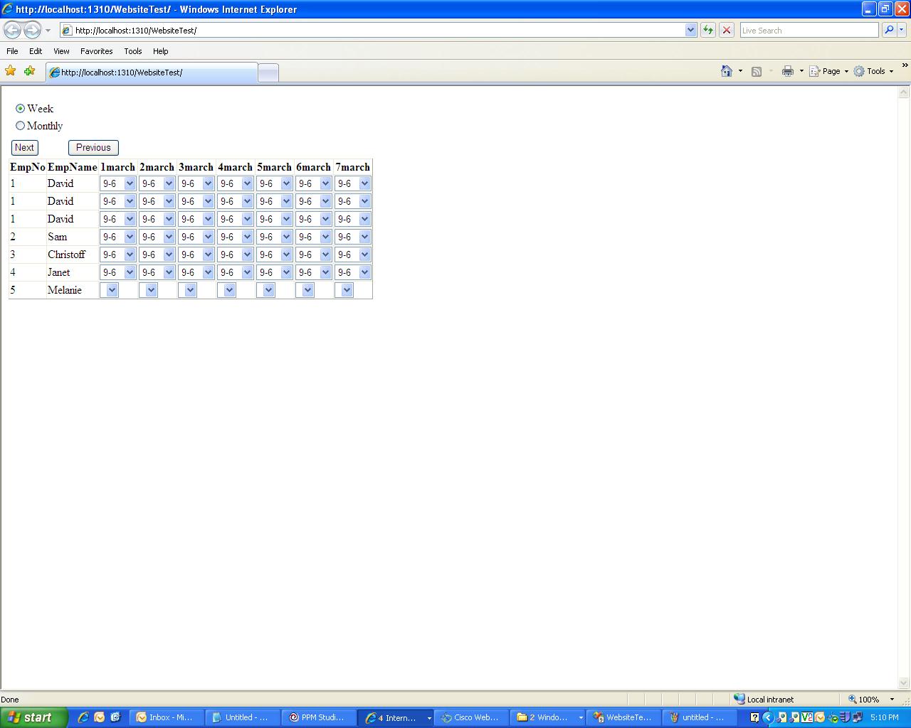 example,i have attached a sample ,i need the data to display from that and whole grid to save it once i click on save button,and for previous and next buttons weekly details should be displayed