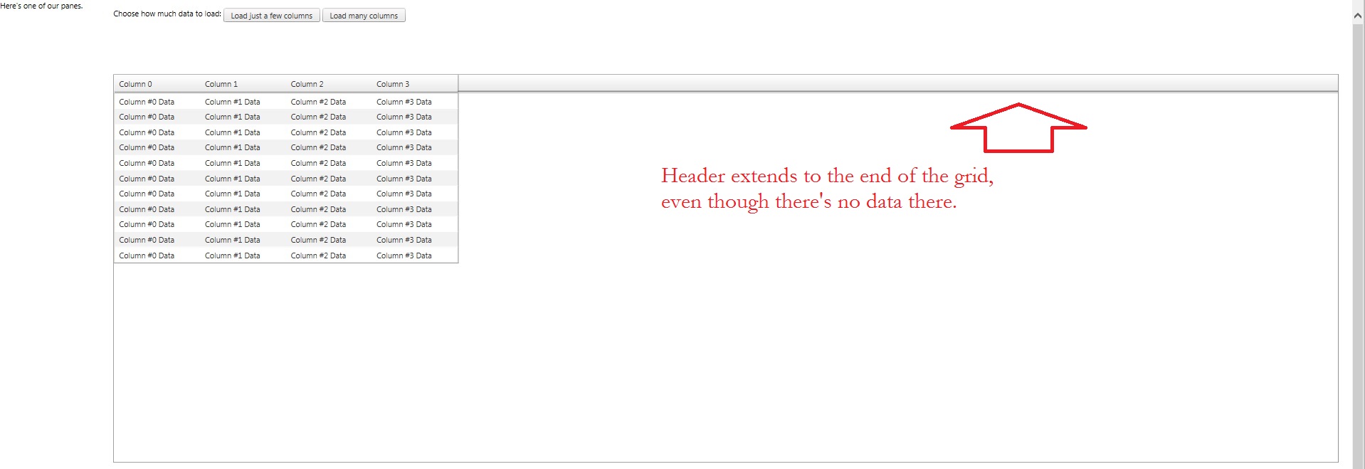 <tr style="height: 75%"> <td style="height: 85%"> <div id="Div1" style="height: 90%; width: 100%"> <Telerik:RadGrid ID="RadGrid1" runat="server" GridLines="Both" CellSpacing="0" CellPadding="2" width="100%" Height="100%" EnableViewState="false"> <MasterTableView TableLayout="Fixed" CssClass="AutoShrink"> <HeaderStyle Width="120px"/> </MasterTableView> <ClientSettings> <Scrolling FrozenColumnsCount="2" AllowScroll="True" UseStaticHeaders="True" SaveScrollPosition="True"> </Scrolling> <Resizing AllowColumnResize="false" ClipCellContentOnResize="true" AllowResizeToFit="false" ResizeGridOnColumnResize="true"/> </ClientSettings> </Telerik:RadGrid> </div> <div style="font-size: 10pt"> This is our grid.</div> </td></tr>