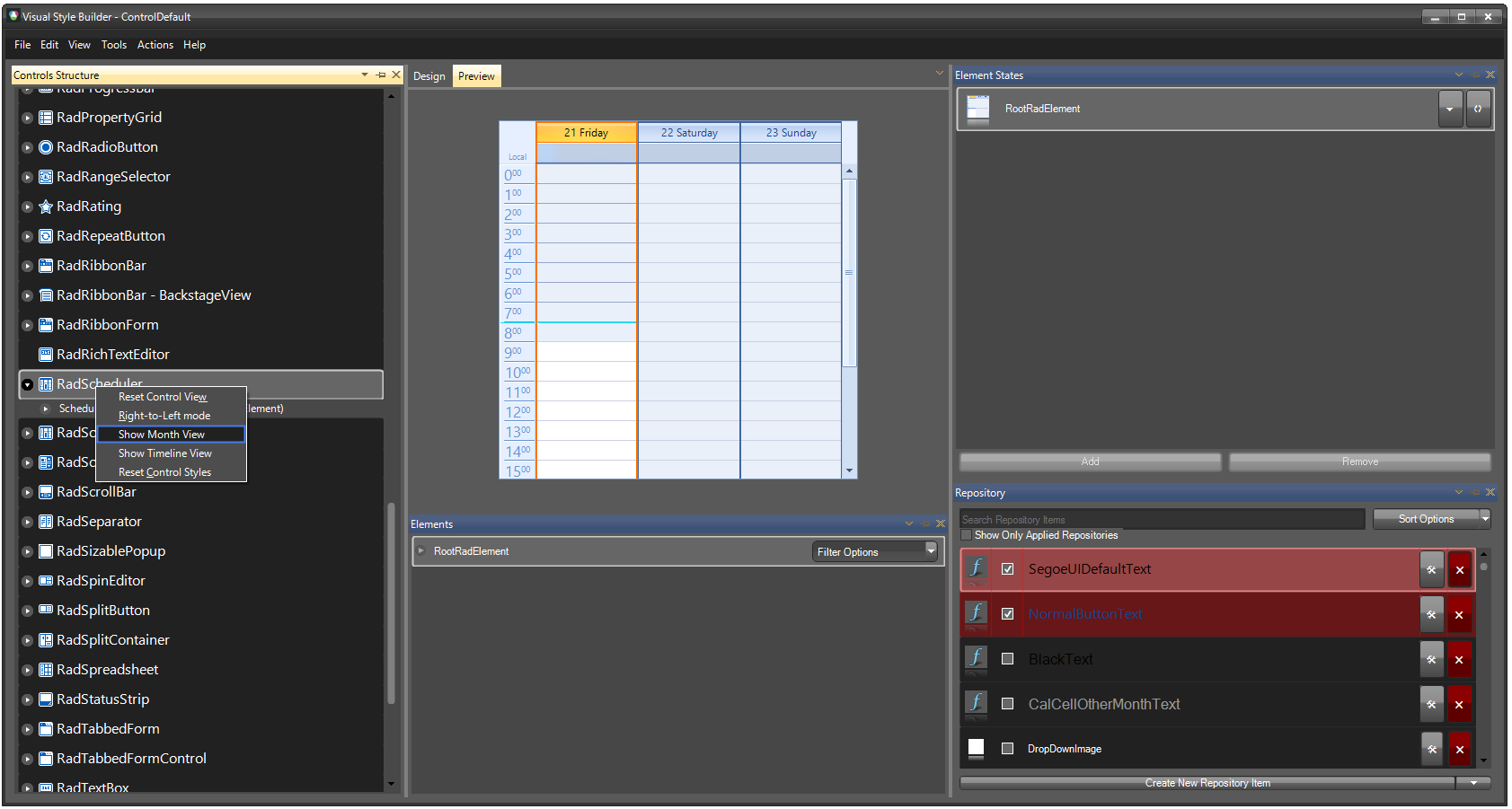 Thank you I am aware of this. The problem is that inside Visual Style Builder, I am able to set the view to 'week', 'timeline'. My friend is also using telerik, and he is able to set the view to 'week', 'timeline' and 'agenda' view. How come I am missing the 'agenda' view?