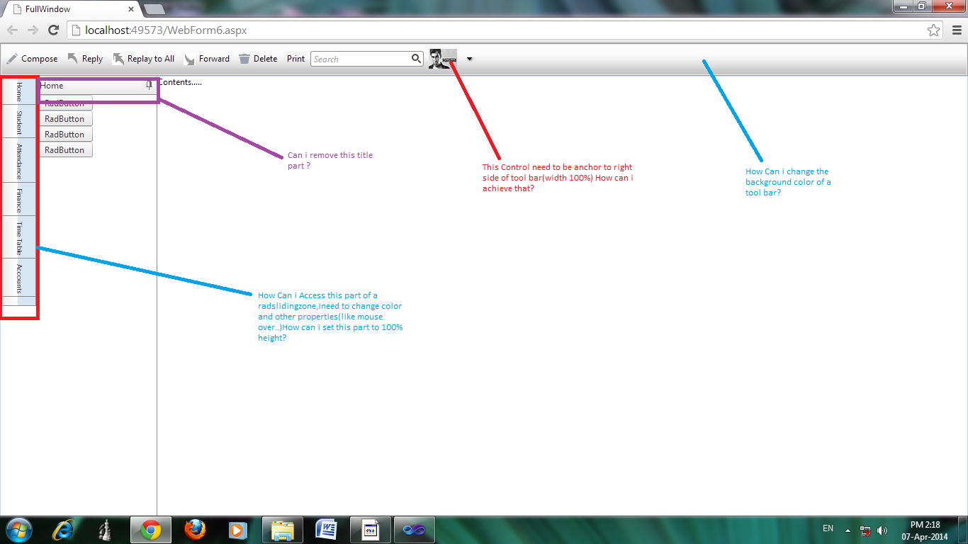 I just started to develop asp.net web application using Rad Controls.In a web page i added a radtoolbar,radsplitter radpane radslidingzone,radsliding pane as shown in attached image.I have some doubts about the controls.And i explained my questions in the attached image.