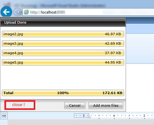 1- according to attached picture in my upload window there is not "close button" and how i can add it?