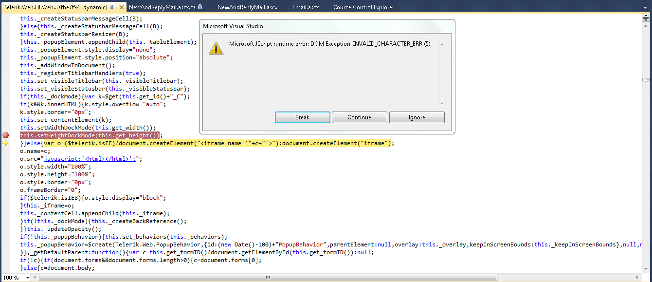 "DOM Exception: INVALID_CHARACTER_ERR (5)" & from second click onwards its just opening the rad window but its not displaying the content.