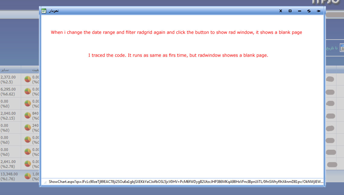 I traced it. the code executes normally and the data that must be showed in the radwidow is generated successfully but a blank page is showed.